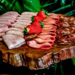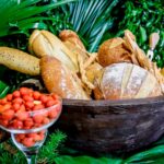 Lindamente montada com: Pães artesanais; Pastas com especiarias; Queijos selecionados; Frutas da estação; Embutidos; Conservas.